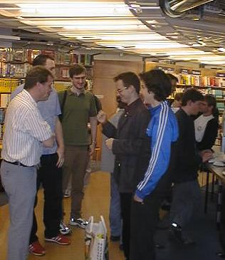 LugBE Informationsstand in der Buchhandlung Jäggi in Bern, 25. Mai 2002Die LugBE hat bereits einige Events organisiert und erfolgreich durchgeführt. Dies waren eher technisch orientierte Anlässe, und setzten oft gar fundierte GNU/Linux-Kenntnisse voraus. Dazu gehören sicher die regelmässigen Vorträge jeweils im Restaurant Beaulieu in Bern, sowie mehrere Install-Parties und eine Grill-LAN-Party. Die LugBE hat sich jedoch nun eine weitere Aufgabe gestellt: GNU/Linux auch den Leuten näher zu bringen, welche wenig oder gar keine Erfahrungen mit GNU/Linux haben, und dadurch ein breiteres Publikum für den Einsatz von GNU/Linux zu gewinnen. Da sich das schlecht nur im Rahmen von "vereins-internen" Vorträgen umsetzen lässt, mussten wir eine Möglichkeit finden, an eine breitere Oeffentlichkeit zu gelangen. Ueli Zbinden hat darauf mit Herrn Heiner Graf von der Buchhandlung Jäggi Kontakt aufgenommen, und daraus entstand ein Informationsanlass in der Computerabteilung der genannten Buchhandlung. Jäggi konnte seinen Kunden so eine weitere Dienstleistung bringen, für uns ergab sich die Gelegenheit, neue Leute auf GNU/Linux einerseits und auf die LugBE andererseits aufmerksam zu machen. Ein Info-Tisch sowie ein mit SuSE 8.0 vorinstallierter PC standen uns und den Interessierten zur Verfügung.